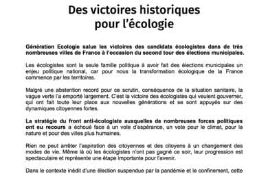 Génération Ecologie salue les victoires des candidats écologistes dans de très nombreuses villes de France à l’occasion du second tour des élections municipales.