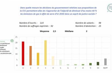 Les notes attribuées par les 150 citoyennes et citoyens ne sont ni « sévères », ni « dures » comme ont pu l’énoncer certains commentateurs, mais justes et fondées sur une analyse factuelle et détaillée des réponses apportées par le gouvernement sur chacune des 149 propositions. Il en résulte une note de 2,5/10 sur l’efficacité des décisions gouvernementales pour réduire les émissions de gaz à effet de serre, et 3,3/10 en termes d’appréciation de la prise en compte par le gouvernement des propositions de la Convention Citoyenne pour le Climat. Le gouvernement n’a obtenu la moyenne sur aucun des votes sur les six chapitres des propositions.