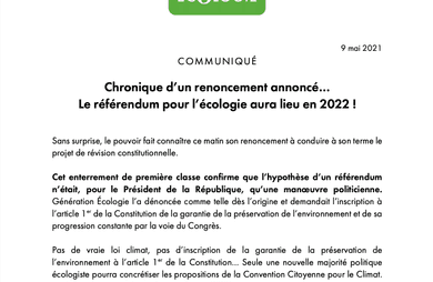 Cet enterrement de première classe confirme que l’hypothèse d’un référendum n’était, pour le Président de la République, qu’une manœuvre politicienne. Génération Écologie l’a dénoncée comme telle dès l’origine et demandait l’inscription à l’article 1er de la Constitution de la garantie de la préservation de l’environnement et de sa progression constante par la voie du Congrès.