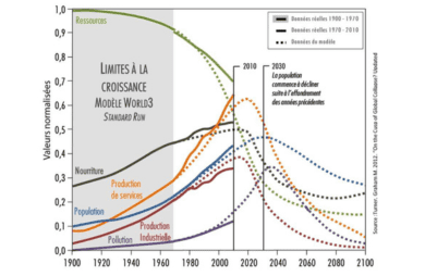 Une croissance infinie dans un monde fini est physiquement impossible. Poursuivre cet objectif conduit à des risques d’effondrements. Dès 1972, le rapport Meadows sur “les limites à la croissance” a mis en évidence ces risques. Depuis 2009, des scientifiques (du Stockholm Resilience Center) ont défini le concept de limites planétaires. Celles-ci délimitent l’espace de sécurité pour la survie de l’humanité sur Terre, fondé sur onze processus naturels qui, ensemble, régulent la stabilité et l’habitabilité de la planète. Cinq limites sont d’ores et déjà franchies : l’érosion de la biodiversité, le changement climatique, le changement d’usage des sols, la perturbation des cycles biogéochimiques de l’azote et du phosphore. Deux autres seront dépassées d’ici 2050 : l’acidification des océans et l’utilisation d’eau douce. L’empreinte écologique des activités humaines est actuellement supérieure à la biocapacité de la Terre. L’humanité consomme l’équivalent de 1,7 planète chaque année, et si tout le monde avait le même mode de vie que celui que nous connaissons en France, cette empreinte serait équivalente à 2,7 planètes. Or il n’y a pas d’avenir pour l’humanité sans revenir à un modèle de société qui respecte les limites planétaires.