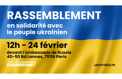 Nous appelons chacune et chacun à se mobiliser aux côtés de la communauté ukrainienne lors du rassemblement prévu à 12h ce jour devant l’ambassade de Russie et à 18h place de la République.