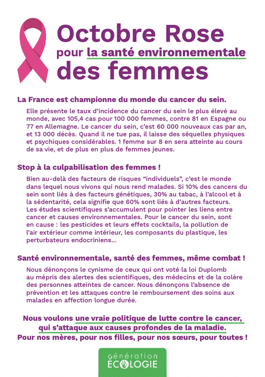 Nous voulons une vraie politique de lutte contre le cancer, qui s’attaque aux causes profondes de la maladie. Pour nos mères, pour nos filles, pour nos sœurs, pour toutes !