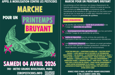 Rendez-vous à Paris, au métro Grands Boulevards, à 14h, le samedi 4 avril 2026 pour la Marche pour un Printemps Bruyant.